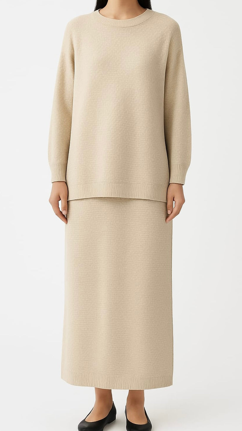 Twinset met lange mouwen en rok "Twinset Hidaya". Deze prachtige twinset is ontworpen voor de moderne vrouw die waarde hecht aan comfort zonder in te leveren op elegantie.